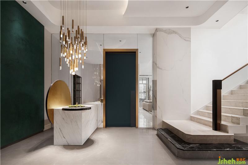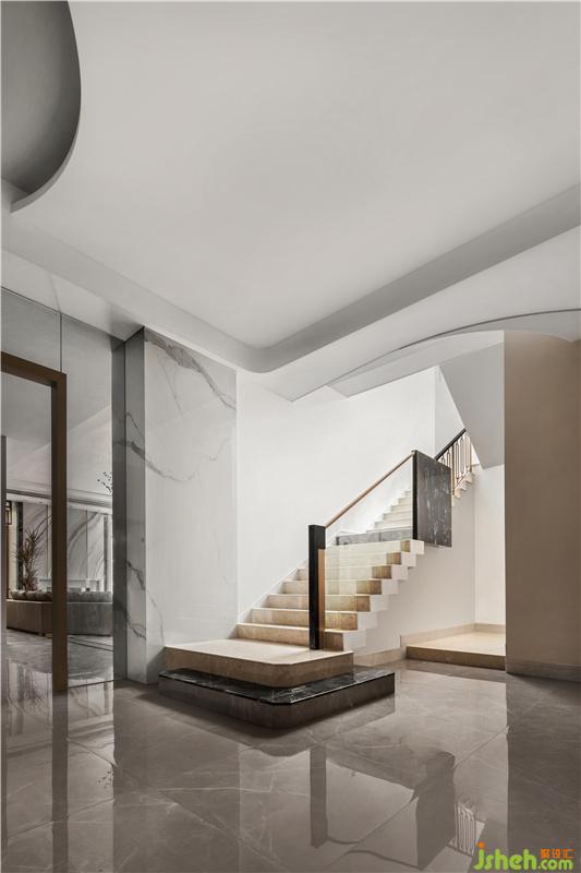 與會客廳相連的過道是整個地下一層的緩沖區(qū)域,貫穿右側(cè)的吧臺,讓空間得到了延伸,同時兼具導(dǎo)向意義。由于負(fù)一層層高達(dá)到了4.6米,所以樓梯步級特別長,因此設(shè)計師在中間平臺處做了一個設(shè)計轉(zhuǎn)換,既打破了長樓梯帶來的心理壓力,同時增添了設(shè)計的趣味性。