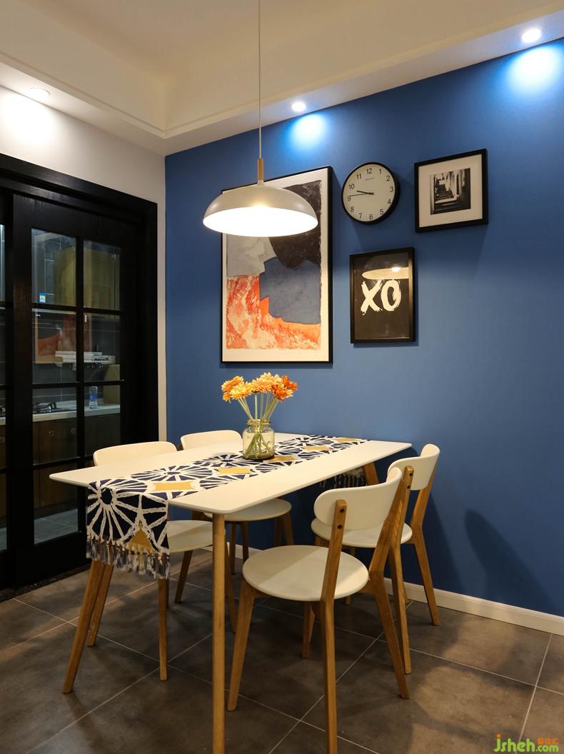 顏色運用上整個空間是以色塊形式表達,以及用深藍色乳膠漆搭配移動家具單人黃色沙發(fā),會在其他軟裝上會有相互呼應的顏色搭配。