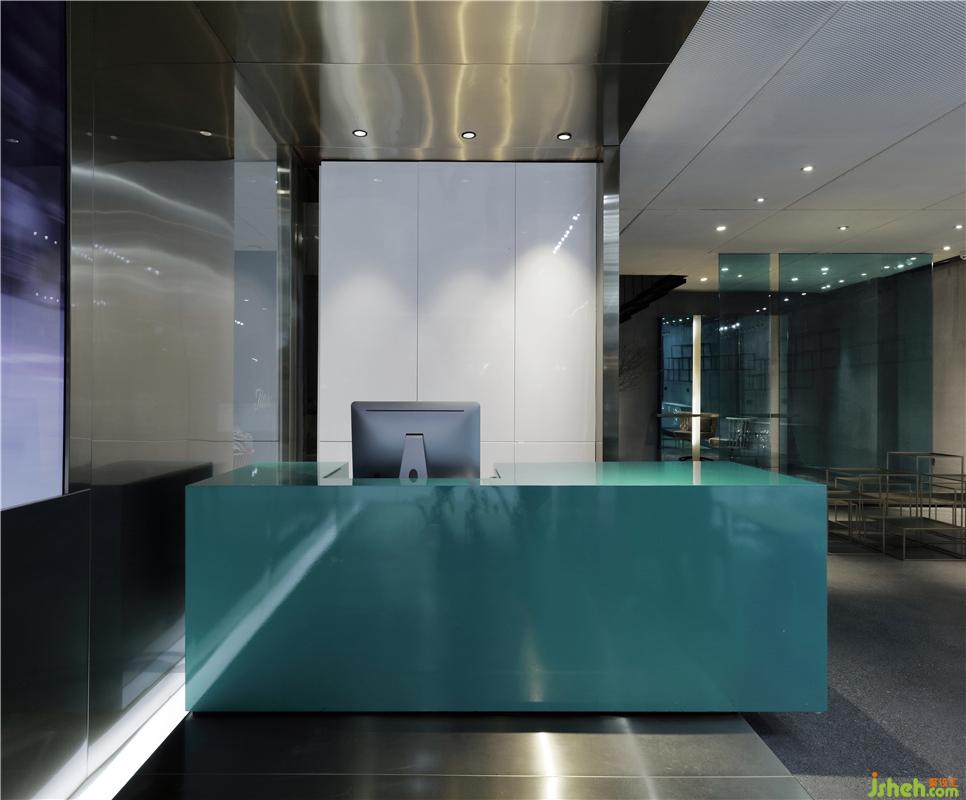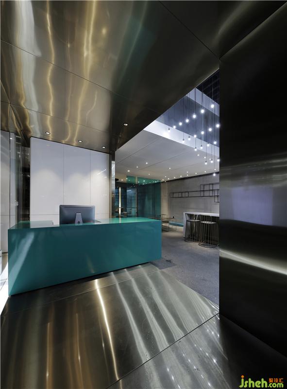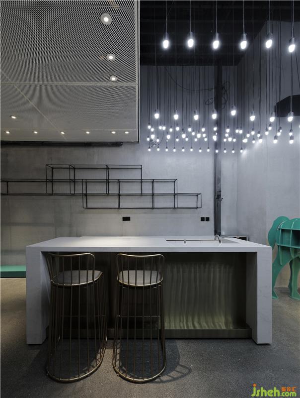 源自于服裝T臺、香檳金不銹鋼包裹的狹窄入口走廊,地面的光帶散發(fā)到金屬板表面的反射,裝修設(shè)計營造出未來時尚科技感的光影,配合著走廊無限播放的時尚秀場畫面和音樂,心情隨之澎湃起來;沿著T臺走到那抹指引動線的蒂芙尼藍(lán)極簡收銀臺,轉(zhuǎn)角進(jìn)入淳樸的休息區(qū)空間,大有桃花源般豁然開朗的感覺。連接各區(qū)域之間的吊頂用鋼板拉伸網(wǎng)材料,把天棚管道線路給掩蓋掉,既延續(xù)了粗獷的質(zhì)感,又流露出對細(xì)節(jié)的細(xì)膩處理。