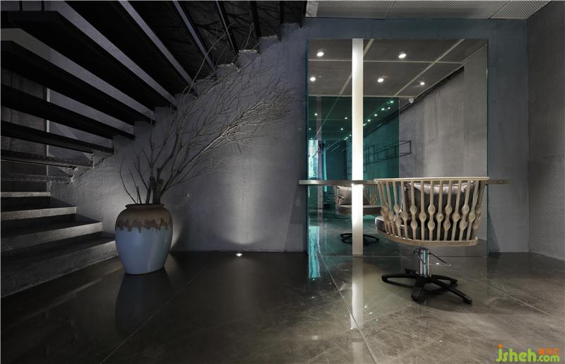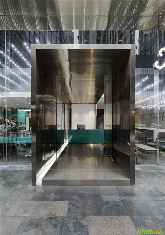 形象門面巧妙的保留原建筑粗獷的火燒面花崗石表面,使用超白玻璃、香檳金不銹鋼等細(xì)膩的現(xiàn)代材料,形成強(qiáng)烈的對比,并把入口安置在一個巨大的金屬盒子里;而在摒棄傳統(tǒng)美發(fā)店三色旋轉(zhuǎn)柱標(biāo)識的同時,挑空區(qū)那片發(fā)絲般飄逸的陣列燈泡,柔化其外觀硬朗的氣質(zhì),讓空間變得立體而又動感,用強(qiáng)烈的視覺感受來體現(xiàn)美發(fā)的行業(yè)屬性。裝修設(shè)計
