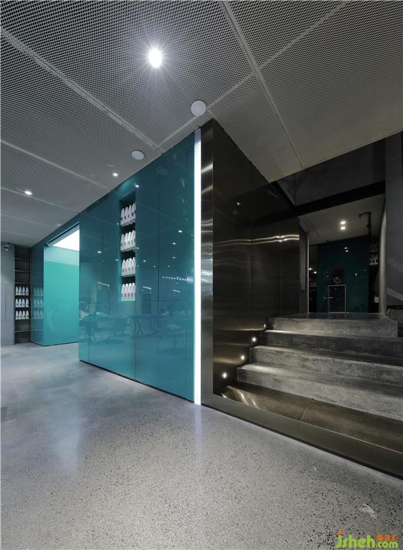 歌劇舞臺(tái)概念的貴賓區(qū),用一個(gè)強(qiáng)烈的L型金屬體塊劃分出來(lái),粗獷的水泥臺(tái)階、黑色的鋼吊工業(yè)樓梯、淳樸的樹(shù)枝陶瓶裝飾、通透的蒂芙尼藍(lán)玻璃隔斷,組合在一起,頗有舞臺(tái)場(chǎng)景的畫(huà)面感。與之相鄰的蒂芙尼藍(lán)盒子中間用一條光帶切割出空間的界限,獨(dú)立又極富雕塑感。而在美發(fā)區(qū)又回歸到原始淳樸的空間感覺(jué),目的是為了讓專業(yè)回歸本源,安靜的專心做一個(gè)屬于自己的發(fā)型。裝修設(shè)計(jì)