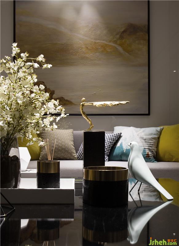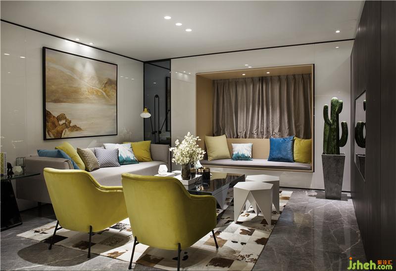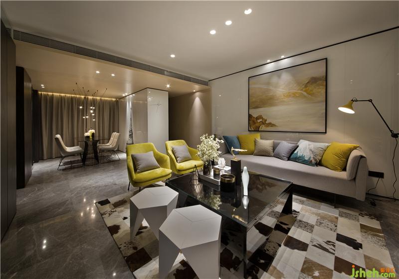 整體空間的動靜區(qū)域規(guī)劃分別以黑白色系來區(qū)分。黑色是謐靜,白色是純凈,過分的純粹反而讓空間感覺到冰冷,甚至會令人產生距離感;而家是有溫度的空間,所以在追求時尚感的同時,選用代表著希望和朝氣的黃色系,對空間環(huán)境進行調劑。樣板房設計