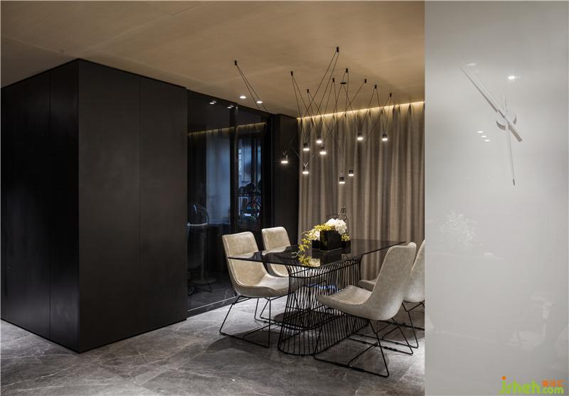 踏入玄關,土耳其灰大理石的地面延伸至公共區(qū)域,走廊兩側在滿足儲物功能需求的前提下,表面全部用黑色填滿,目的是讓人的心情迅速的平靜下來;而天棚上那一抹溫潤的木色把視線指引到更光明的地方,慰藉著疲憊的身心。樣板房設計