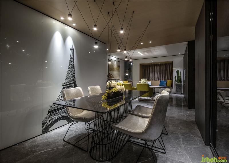 餐廳與公衛(wèi)的隔墻,巧妙的形成一個白色的立方體,猶如雕塑般屹立在整個活動空間;立方體上的黑色埃菲爾鐵塔圖案,那是對時尚之都的向往,倚在餐廳的椅子上喝杯紅茶,就仿佛身在香榭麗舍大道,流露出一絲絲浪漫的氣息。