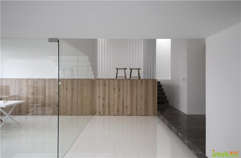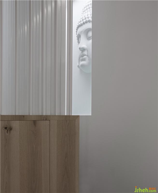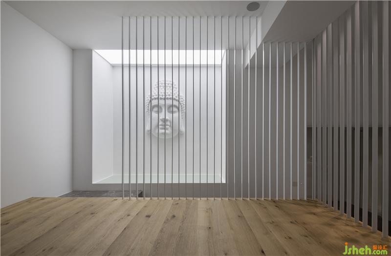 經(jīng)過(guò)反復(fù)驗(yàn)證,把洽談和會(huì)議功能這個(gè)區(qū)域的地面高度降低,形成一個(gè)中轉(zhuǎn)平臺(tái),并把所有的收納功能集合在這個(gè)盒子內(nèi),用原木包裹,形成空間的樞紐中心;為了保證隱私、通風(fēng)采光及安全,盒子的圍擋采用矩管格柵的形式,通過(guò)格柵觀看樓梯邊的佛像及樓梯下行走的人,會(huì)讓平靜的空間產(chǎn)生互動(dòng)的波瀾。在二樓挑空的墻體上的那條縫,也是起到采光通風(fēng)的作用,并避免視覺(jué)上的擁堵。辦公室設(shè)計(jì)