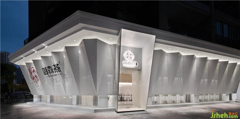 店鋪外皮覆蓋著由燕尾脊演化的幾何圖形,并用這個圖形組合成屋檐下燕窩的形狀。這個白色表皮既有現(xiàn)代的視覺張力,又有深厚的文化內(nèi)涵,直觀的體現(xiàn)了品牌的調(diào)性。網(wǎng)孔狀鋁單板在保證通風和采光的同時,也保護了客戶的隱私。