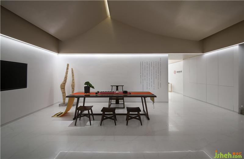 而入口對面的形象墻,我們也摒棄了傳統(tǒng)品牌形象墻的表現(xiàn)方式,以表達品牌文化為主要的呈現(xiàn)手法,前面擺放中式茶桌,加強品牌的親和力。裝修設計