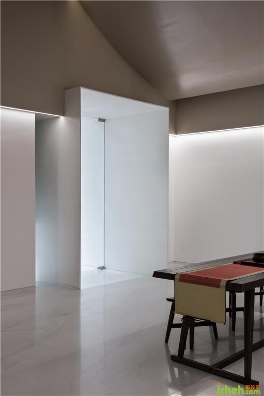 通過一個白色的長方形盒子,我們進入了內(nèi)部空間,整個大堂空間讓人覺得空靈又溫暖,天棚由兩片弧形組成,有著似曾相識的感覺;這是由民居屋頂演化過來的,用現(xiàn)代的表達方式來呈現(xiàn)文化記憶,而天棚顏色則是兒時記憶的屋頂瓦片顏色所提取的。裝修設計