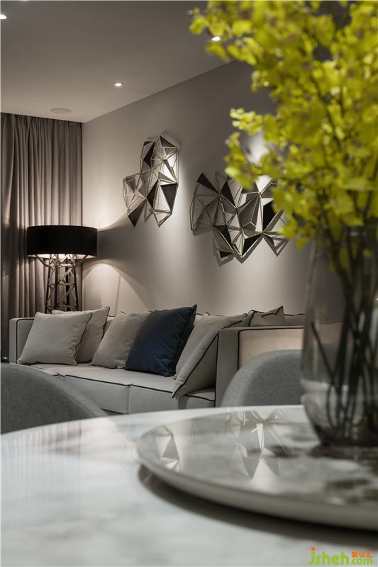以電視墻隔開活動區(qū)和休息區(qū),為了增大活動區(qū)的視覺空間,活動區(qū)的門全部以隱藏的形式。從客廳往廚房方向看,玄關(guān)和廚房融為一體,形成一個(gè)白色的盒子,成了這個(gè)空間的視覺焦點(diǎn),而活動區(qū)的所有空調(diào)設(shè)備全部隱藏在白色盒子內(nèi),最大限度的抬高客廳及餐廳的層高,避免壓抑。電視背景墻與休息區(qū)入門及餐廳背景墻做成一體,讓活動區(qū)更加整體。室內(nèi)設(shè)計(jì)師
