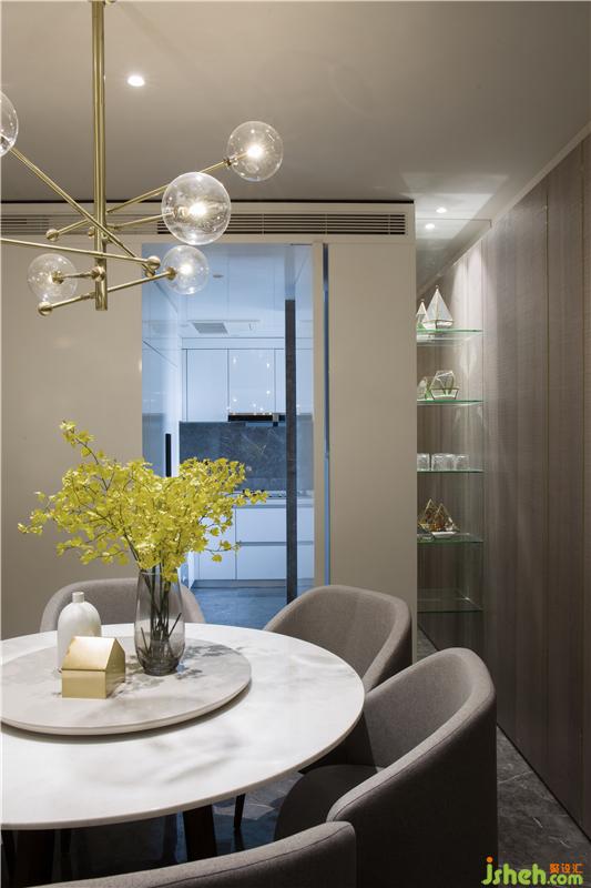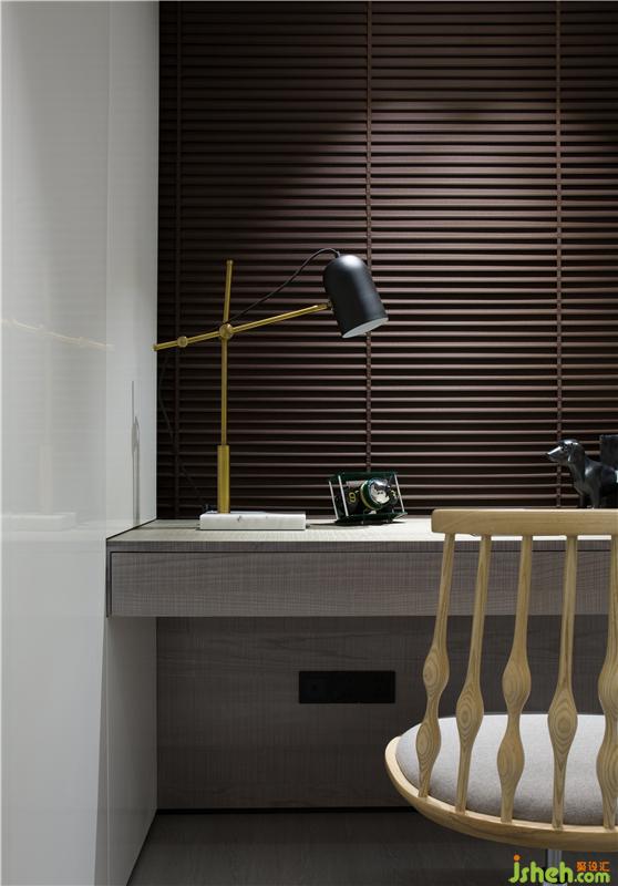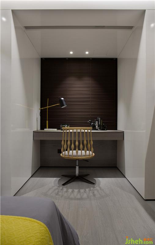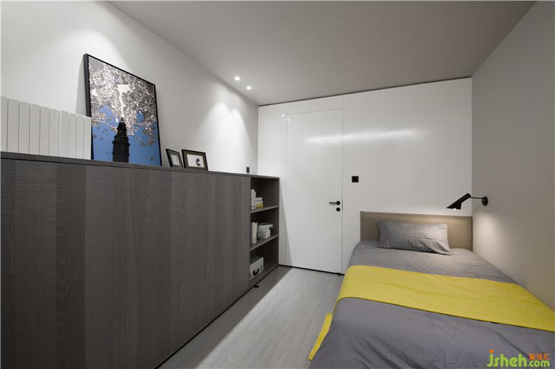左手第一間是兒童房,利用承重墻的墻垛,分開做了兩個衣櫥,中間的窗戶區(qū)域則做成了書桌,整體形成一個白色的盒子,呼應(yīng)活動區(qū)的廚房白盒子;另一張床則隱藏在書柜里,這是滿足主人未來的成員需求。室內(nèi)設(shè)計師
