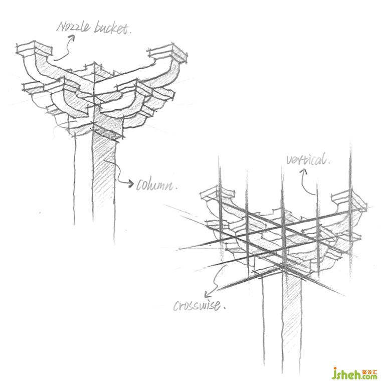斗拱,又名“枓栱”。是中國建筑上特有的構(gòu)件,在美學與結(jié)構(gòu)上也擁有其獨特的風格特征。一般用于古時較大建筑物的柱與屋頂間,承擔過渡部分。而在其使用意義上來說,展廳設(shè)計通常帶有紀念性與重要性的建筑物中,才有斗拱的安置。