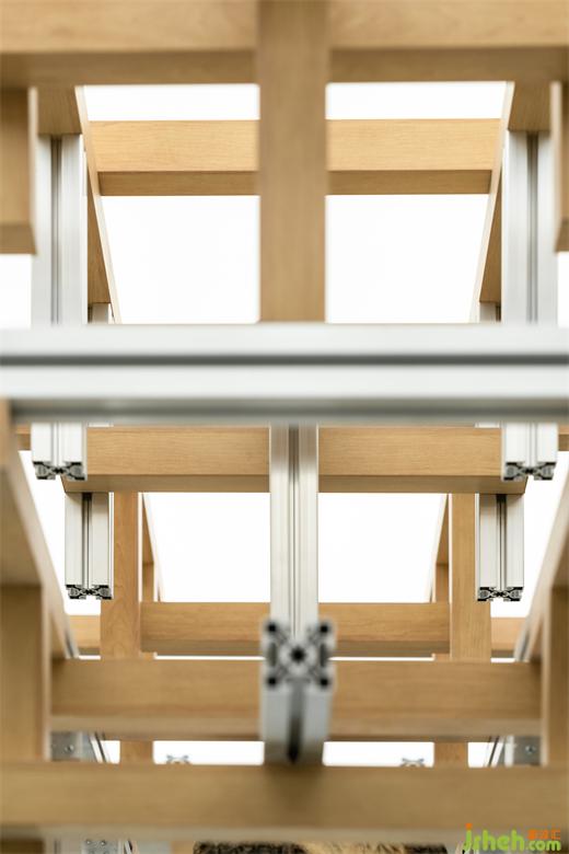 鋁型材與木頭的材質(zhì)的對撞,一方面延續(xù)了品牌既有的工業(yè)屬性,另一方面則通過取材自然元素加入,在一定程度上中和了空間中強勢的機械屬性,展廳設(shè)計創(chuàng)造出和諧共生的場景。