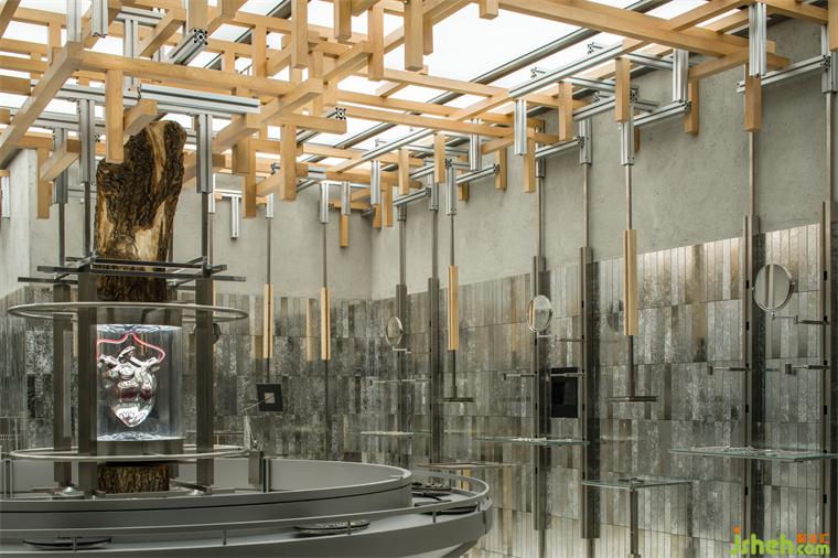 空間提取斗拱這一構(gòu)件背后所承載的文化內(nèi)核,適配當下語境,在原有的斗、升、拱、翹造型組合上做減法,并在傳統(tǒng)木材之上融入金屬材質(zhì),完成整體組合架構(gòu)。