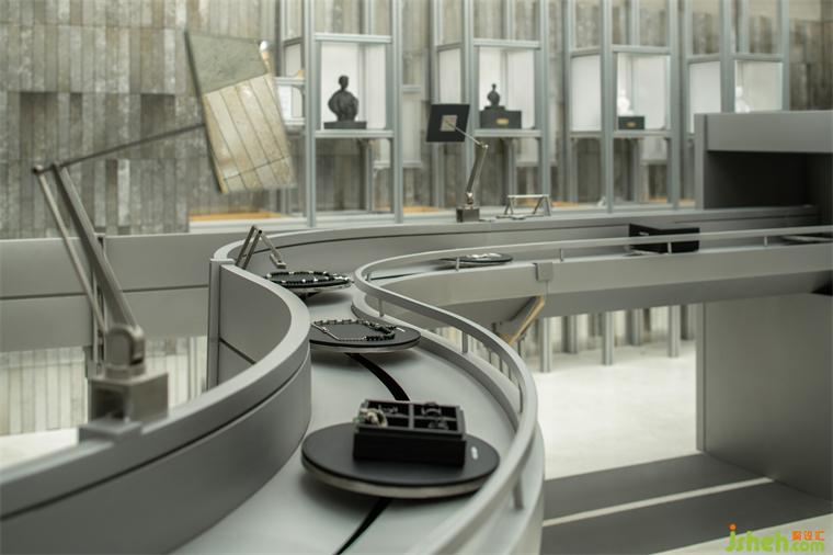 如果將以機械心臟樹為視覺核心,所囊括的由頂部至四面陳列區(qū)域是基于核心概念之下的空間立面呈現(xiàn),那么回歸空間平面重點——傳送帶的設(shè)置,則是進一步貼合實際銷售功能,展廳設(shè)計圍繞商品展示、試戴、售賣與打包的系列行為所設(shè)計的動線閉環(huán)。