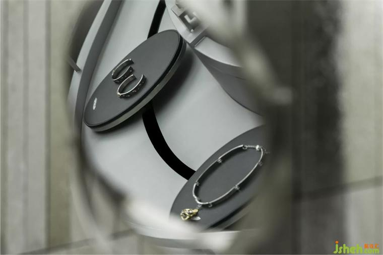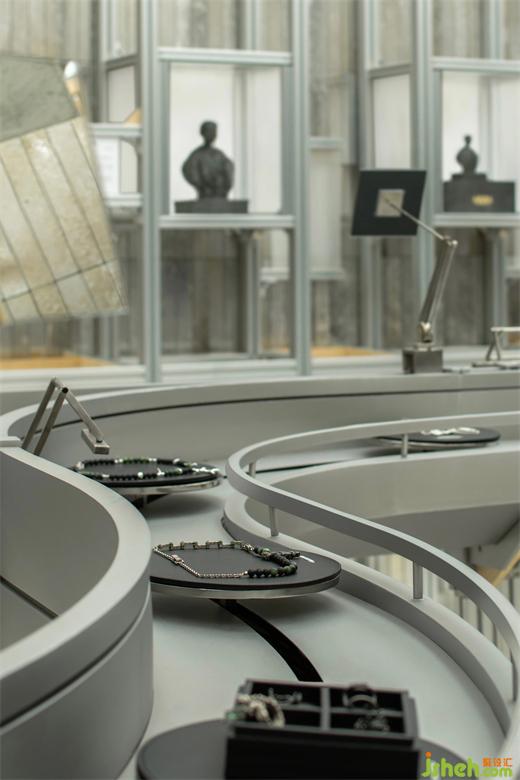 品牌icon單品陳列于傳送帶的圓形托盤中,隨著傳送通道的弧度逐一放置,黑色皮革底盤最大程度地凸顯與還原,金屬與寶石制品本身的質(zhì)感,賦予受眾新穎的觀覽與交互體驗。