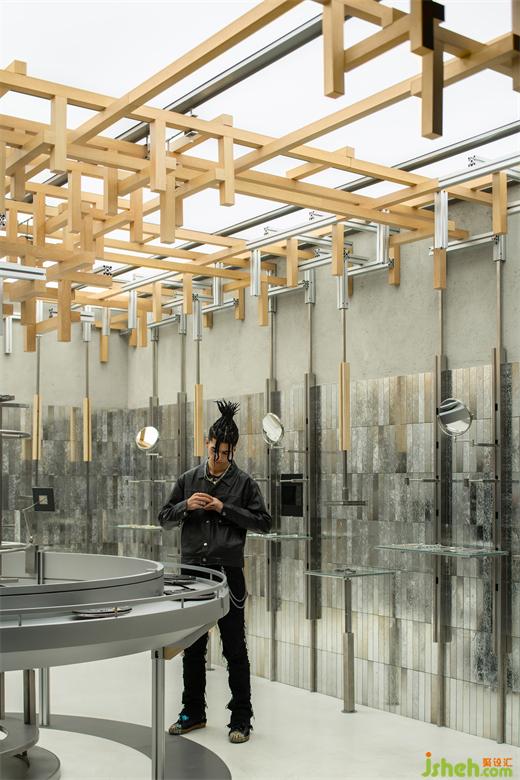 金屬、玻璃等與主體一脈相承材質(zhì)的穿插,圓形鏡子的增設(shè),也考慮到了受眾搭配試戴環(huán)節(jié)的需求,展廳設(shè)計使其在交互體驗中自然地完成選購。