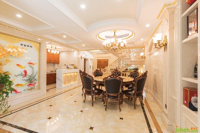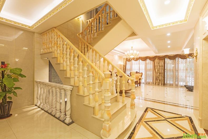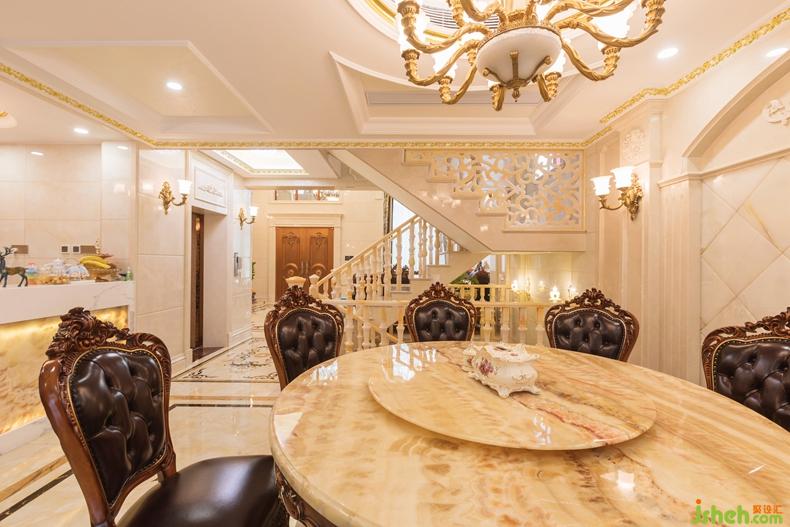 一樓設(shè)計(jì)了一個(gè)中廚和西廚,餐廳,餐廳用了花開富貴為主題的玉雕,采用大量的大理石和玉石,和描金來鋪墊或做點(diǎn)綴,以新古典奢華風(fēng)格演繹空間結(jié)構(gòu),在客廳用了大理石,玉石,做出漂亮,有藝術(shù)性的背景,盡顯奢華。在客廳的偏廳中的小陽臺做了一個(gè)品茶區(qū),滿足了業(yè)主日常生活情趣愛好??蛷d整體空間色調(diào)以暖色為主,用米黃色做基調(diào),而家居以深色為主,點(diǎn)綴金色的線條,整體上存在協(xié)調(diào)感,呈現(xiàn)出溫馨舒適的感覺。室內(nèi)設(shè)計(jì)師