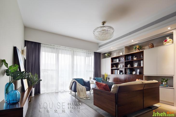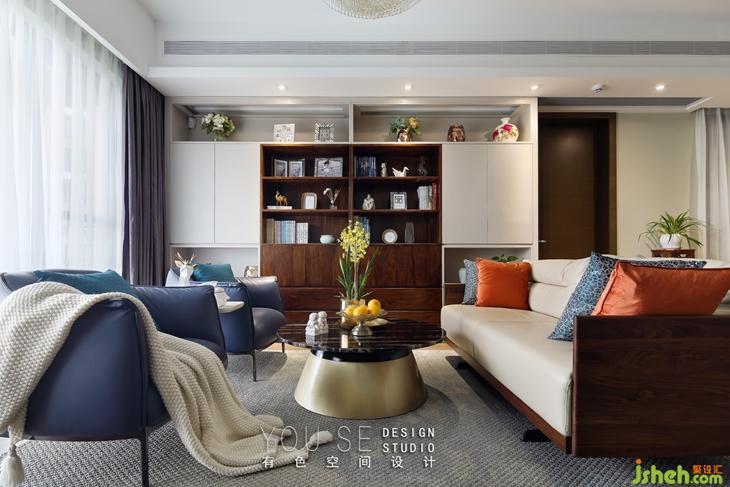整面的書柜在客廳不僅承載收納功能,也要有美觀的體驗,設(shè)計師精心設(shè)計的書柜,很有層次的展示陳列。