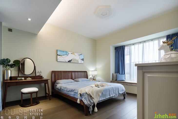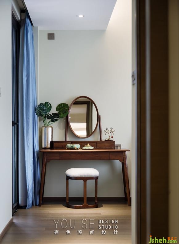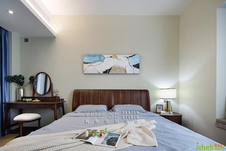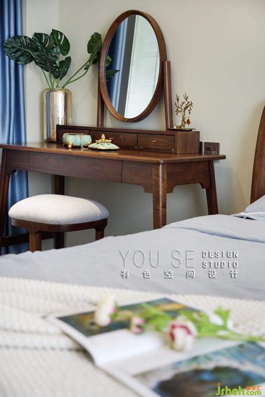 臥室也是走的簡約風,同樣采用胡桃木的床架,配合簡約的床品,比較獨特的是這個胡桃木質(zhì)的梳妝臺,橢圓色的鏡面,繁復花紋的配飾盒,又有了種復古的感覺。