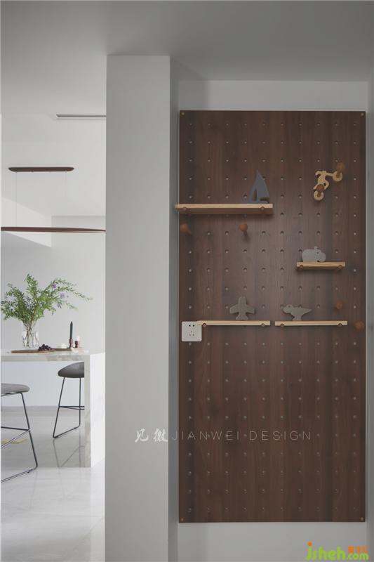 過(guò)道的墻面裝上洞洞板,可以隨意調(diào)配掛件與層板,很不錯(cuò)的收納設(shè)計(jì)。