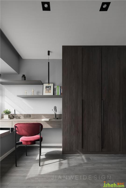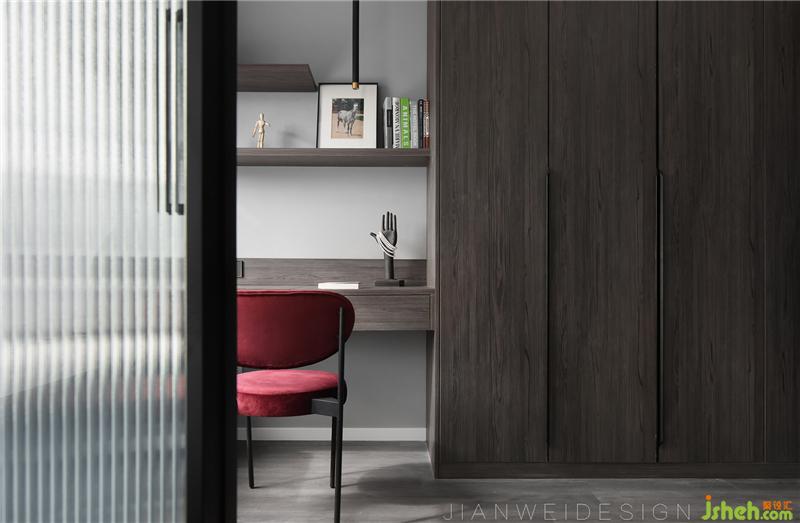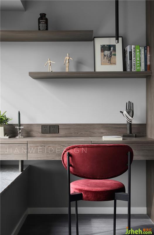 到了適婚年齡的人,總會為未來生活多一些打算,在衣帽間為業(yè)主加入了一個看似梳妝臺又像書桌的設計,一把紅黑色的經(jīng)典桌椅,似乎在虛位以待著女主的到來。裝修設計