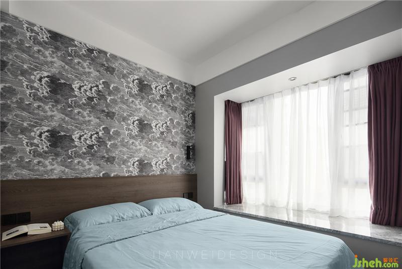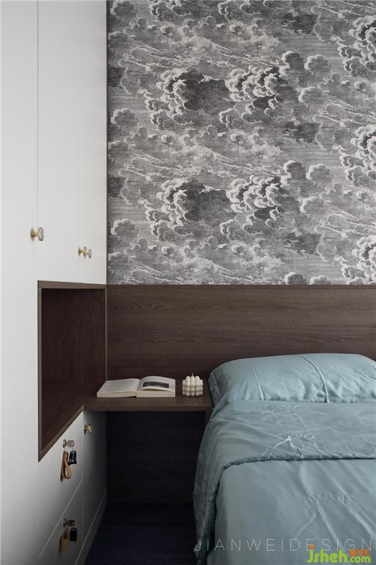 一副水墨煙云,讓整個房間多了一絲傳統(tǒng)簡約設計的風采。胡桃木色的衣柜和床頭設計,精巧的構(gòu)思將整個空間連通到了一起,有些許跳躍的靈氣。