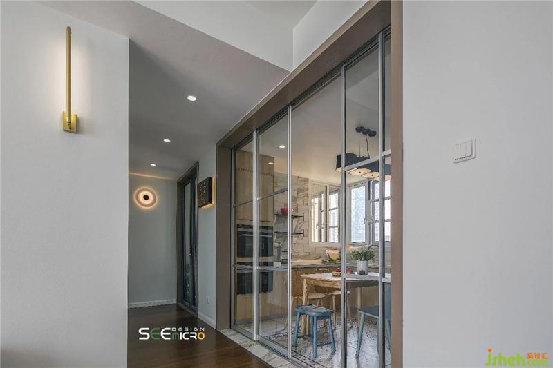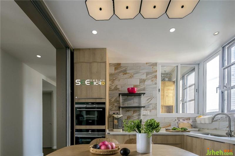 原本要通過(guò)生活陽(yáng)臺(tái)間接采光的小廚房,被設(shè)計(jì)師重新構(gòu)造,餐廳廚房和為一體。簡(jiǎn)潔而實(shí)用的木紋餐桌椅,舒適而自然,給空間賦予木質(zhì)的溫暖;借由廚房玻璃推拉門的設(shè)計(jì),空氣的流通和光線的補(bǔ)充得到很好的解決。民以食為天,擁有大的開(kāi)放式廚房不是夢(mèng)。