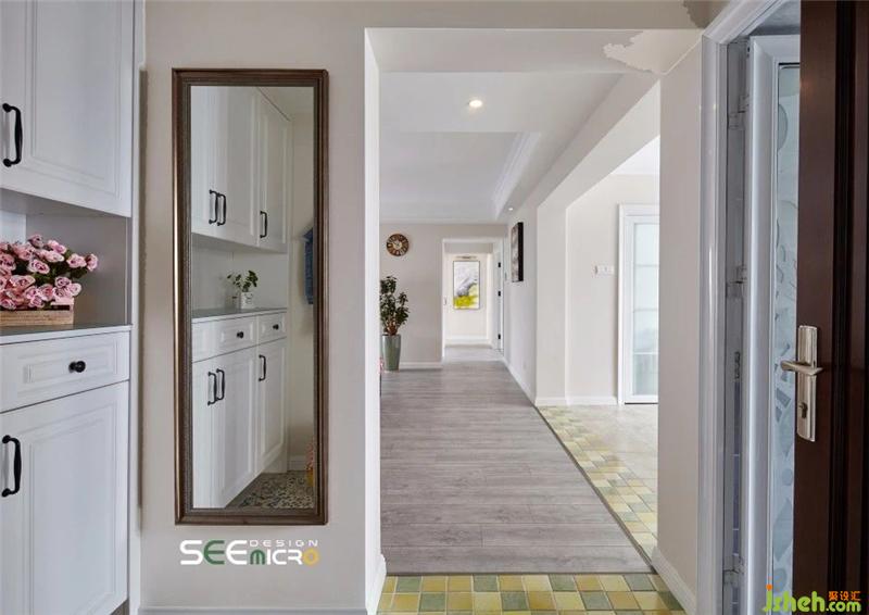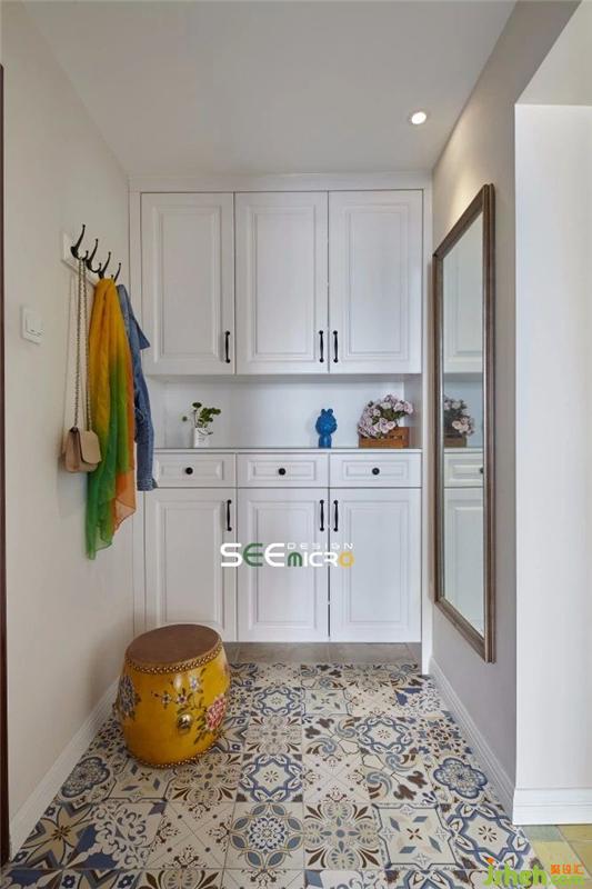 門廳以白色為主色調(diào),上下并行的儲物柜、觸手可及的掛衣鉤與整裝必備的穿衣鏡一應(yīng)俱全。跳色的花紋陶瓷鼓凳功能性與觀賞性兼具,一襲甄選的印花地磚則將民族文藝風(fēng)合宜地嵌入整個空間格局中。