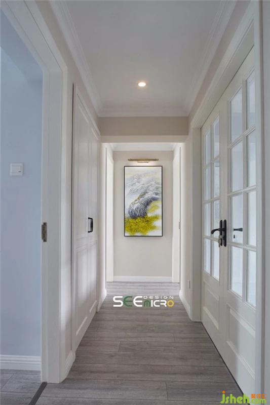 步入門廳,目之所及的是過道盡頭的一幅藝術(shù)畫,設(shè)計師特意以書房的雙開門為過道納入了充足的光線,打造出一條通透的藝術(shù)長廊,使賓客入門便如同置身藝術(shù)展館。