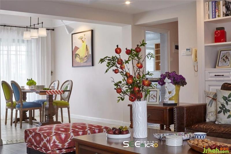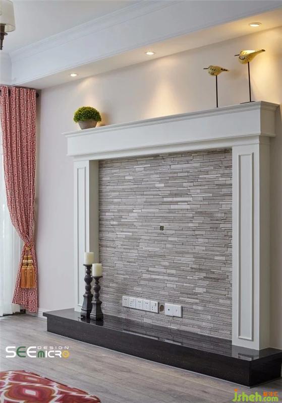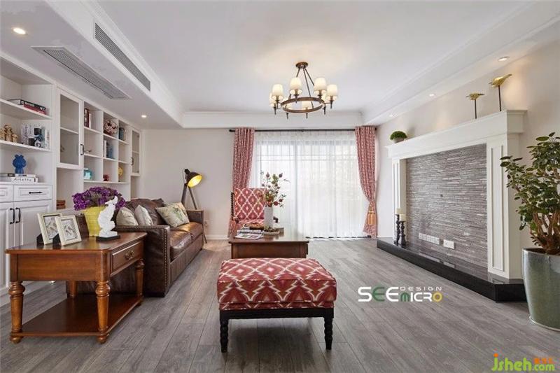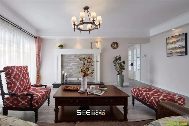 美式鄉(xiāng)村風(fēng)吊燈下,是實用舒適的一桌、一椅、一沙發(fā),選色或沉穩(wěn)、或明艷,與空間底色形成對比,單人位沙發(fā)印花則與窗簾相互輝映。沙發(fā)背后是一整面白色儲物柜,滿足主人收納需求的同時,又可擺放幾件工藝品點綴空間。簡約的壁爐選用與木質(zhì)地板同色系紋理的文化石鋪貼而成,素雅精致。裝修設(shè)計