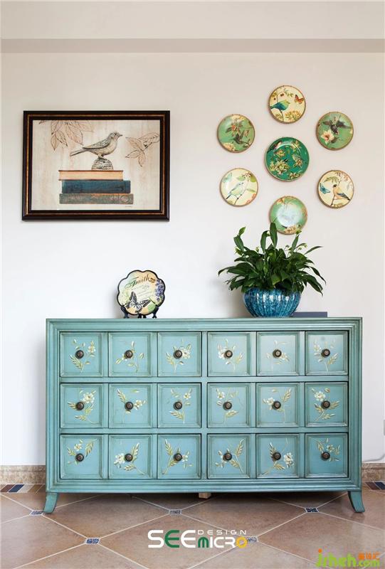 主人鐘意簡潔大氣的居家風(fēng)格,不喜空間雜亂,這點(diǎn)從門廳的兩個(gè)儲(chǔ)物柜——嵌入式收納柜與靠墻而立的門廳柜就可以看出來。門廳設(shè)了一席待客的茶桌,沉穩(wěn)大氣的實(shí)木桌椅在滿足會(huì)客需求的同時(shí),大大提升了整個(gè)空間的質(zhì)感。整個(gè)門廳硬裝、軟裝選色均素雅大氣,墻面復(fù)古的圓盤裝飾、花鳥壁畫與現(xiàn)代式樣的瓶蓋墻飾在風(fēng)格碰撞中綴點(diǎn)了視覺空間。裝修設(shè)計(jì)
