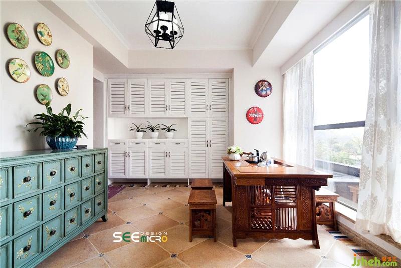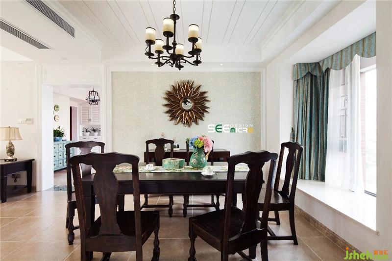 由于采用通透設(shè)計(jì)的手法,整個(gè)用餐區(qū)域采光極好,一邊是從客廳陽臺(tái)延伸而來的光線尾巴,另一邊是源自飄窗十年如一日的暖陽,這是一個(gè)能夠與“光”進(jìn)行互動(dòng)的區(qū)域。敦實(shí)穩(wěn)重的深色系實(shí)木餐桌椅與整體空間色調(diào)形成對比色,而風(fēng)格鮮明奇特的藝術(shù)壁飾與復(fù)古鐵藝吊燈則巧妙地勻去了實(shí)木的沉重感,使得整個(gè)功能區(qū)域?qū)嵱眯耘c審美性兼具。