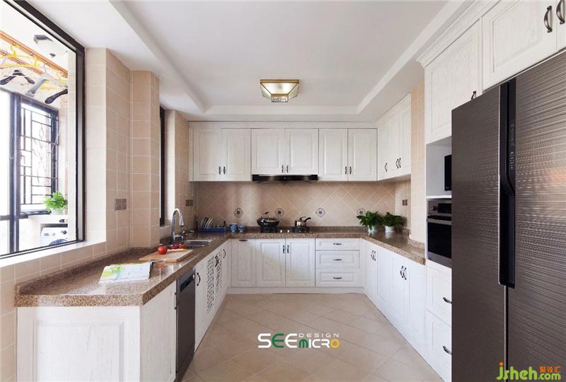 廚房以白色為主基調(diào),簡潔干凈。選用功能極其強(qiáng)大的U形櫥柜,能使主人擁有足夠的收納區(qū)域,同時(shí)可最大限度地利用空間進(jìn)行烹飪,即便是家里來客人了,兩人在廚房里同時(shí)作業(yè)也絲毫不顯擁擠。裝修設(shè)計(jì)