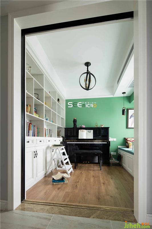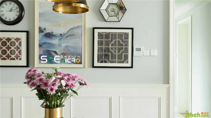 由于整個(gè)空間是淺色系的基調(diào),所以在家具的選擇上選擇以深色皮質(zhì)和金屬吊燈的搭配來做為空間的點(diǎn)綴。桃木色桌腿與白色大理石臺面搭配,長條個(gè)性皮質(zhì)沙發(fā)與綠色皮單椅相結(jié)合則成了餐廳的經(jīng)典。抽象壁畫和幾何圖壁畫提升了整個(gè)餐廳空間的時(shí)尚感, 使整個(gè)餐廳多了幾分生動與暖意,豐富的層次之間盡顯輕奢之優(yōu)雅魅力。裝修設(shè)計(jì)