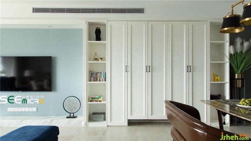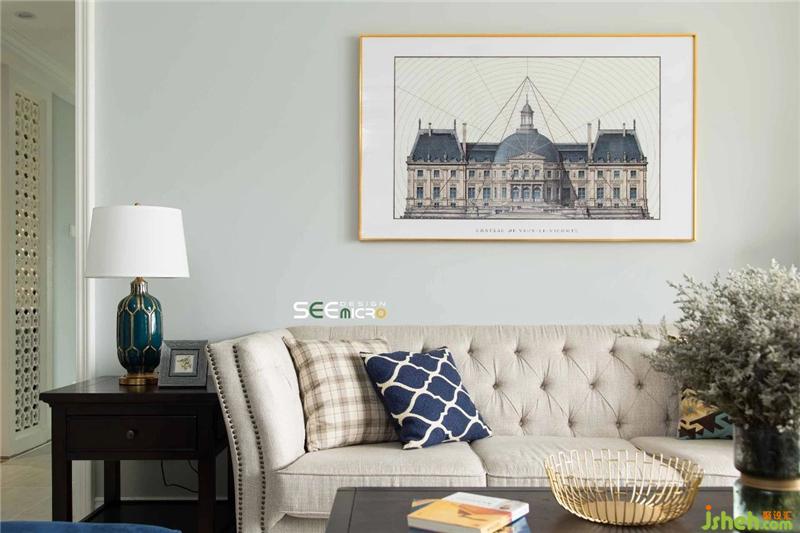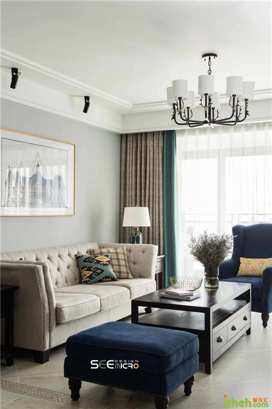 客廳的整體顏色,是通過藏藍(lán)色沙發(fā)和鐵藝質(zhì)感的裝飾來打破空間的沉悶感。整體氛圍比較明亮,清爽,頗具品質(zhì)感。通過一張壁畫豐富了整個(gè)空間的層次感;給家的氛圍增添幾分設(shè)計(jì)感??蛷d墻面整體柜增加了美式經(jīng)典的線條感,沙發(fā)輕奢造型感搭配胡桃木色的茶幾,精致又不失單調(diào),通過窗簾、軟裝飾品的呼應(yīng)讓整個(gè)空間突出了質(zhì)感和舒適感。裝修設(shè)計(jì)