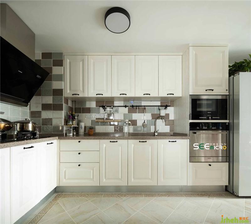 L型白色櫥柜收納柜 ,優(yōu)雅與穩(wěn)重并存,操作臺區(qū)和收納區(qū)分割明確,美學(xué)風(fēng)尚的修飾締造出整體空間律動的層次。裝修設(shè)計(jì)