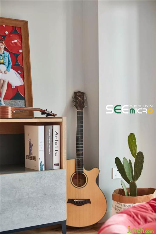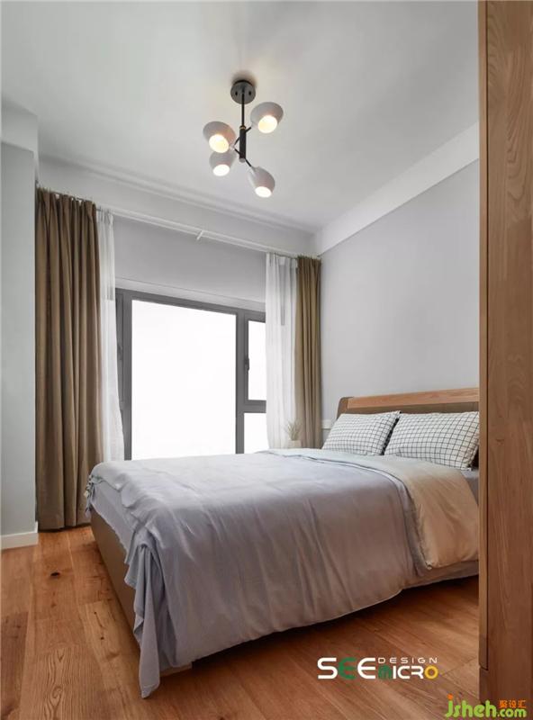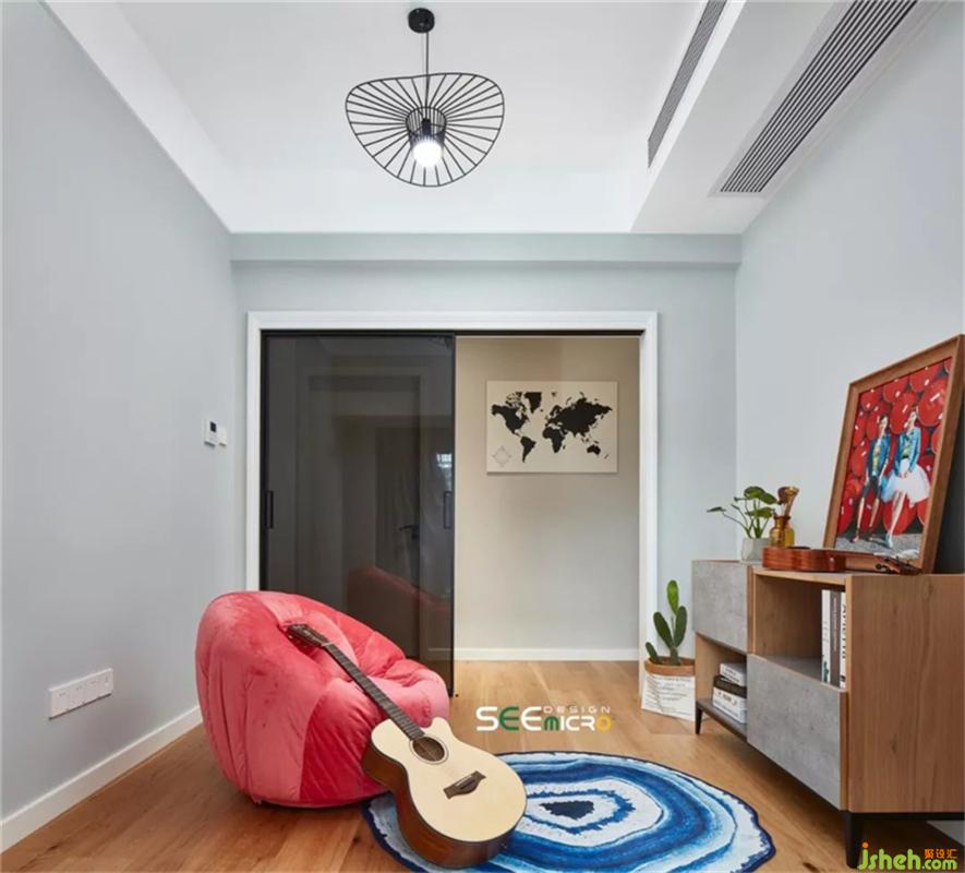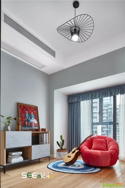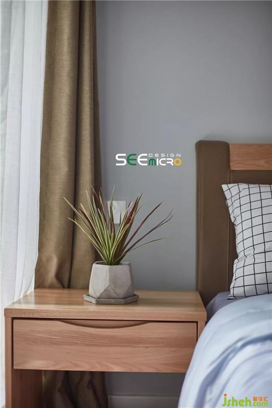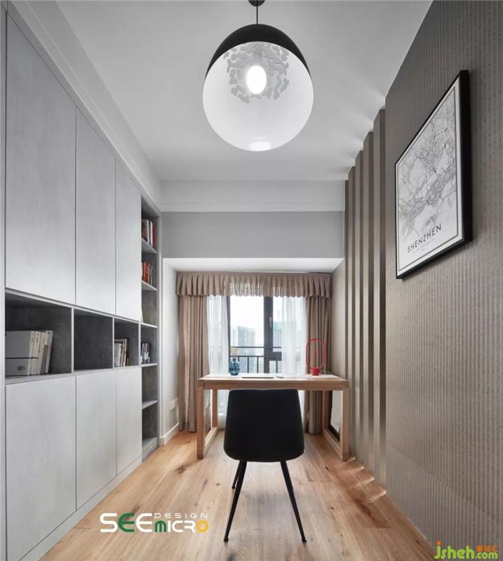 開放式書房的設(shè)計,更具獨(dú)特感。同樣是高級灰色調(diào)的書柜,在這里營造的更多是一種安靜、平和的氛圍。屏風(fēng)設(shè)計采用豎條格柵,不僅有間隔,與主臥有更多靈動,同時又保證通風(fēng)與采光,原木書桌與整個空間的原木地板相呼應(yīng)。