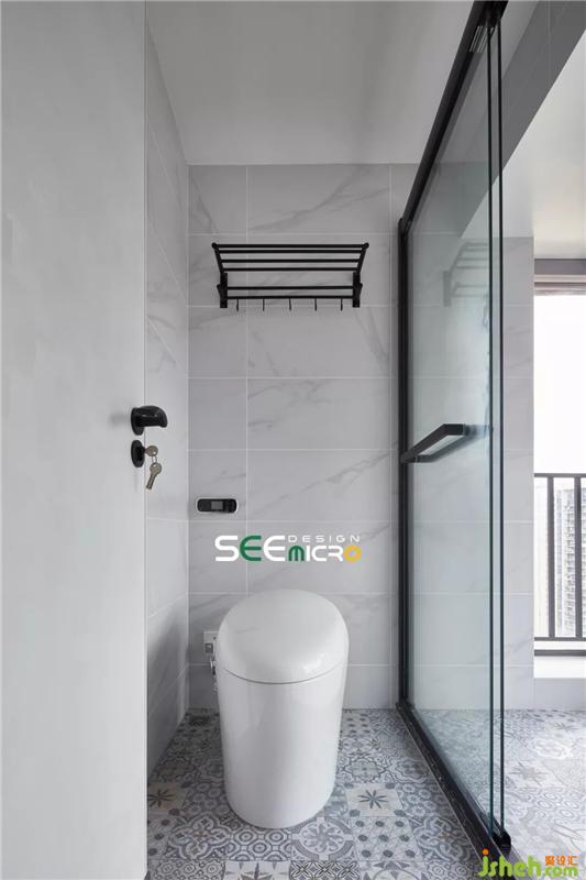 主衛(wèi)干凈的紋理墻磚與花色地磚搭配,衛(wèi)浴空間簡潔且不失質(zhì)感。
