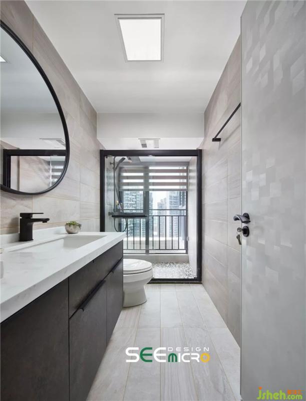 公衛(wèi)圓形衛(wèi)鏡使整個空間柔和了幾分,洗手臺白色臺面與黑色收納柜相結(jié)合,層層疊疊,營造出不同的層次感,使空間變得生動有趣。
