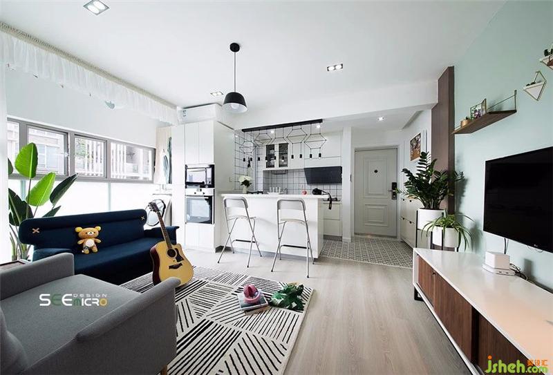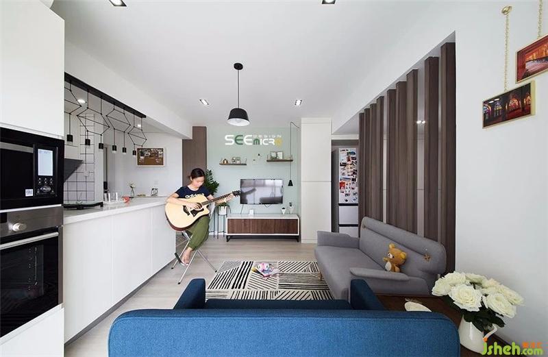 客廳三面墻體,打破三面,僅留其中一面作為電視背景墻,整個客廳瞬間變得“不像56㎡的房子能擁有的客廳”,通透舒適,就像——青春該有的樣子。裝修設計