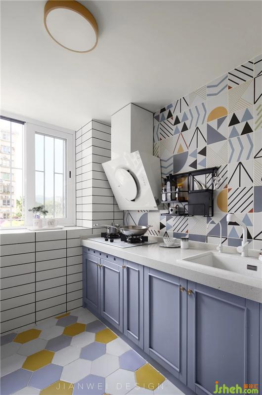 廚房空間不大,但功能齊全,藍(lán)色櫥柜搭配白色面包磚,視覺統(tǒng)一和諧,花磚的點綴格外精致,可以好好的享受每一次做飯的樂趣。