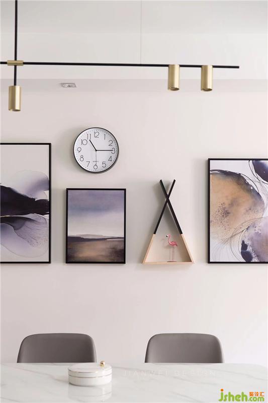 餐廳最吸引人的便是這面裝飾墻了,水墨畫的意境,錯落有致的擺放,拼色細線條,以及一只跳色的火烈鳥,搭配在一起竟意外的和諧。