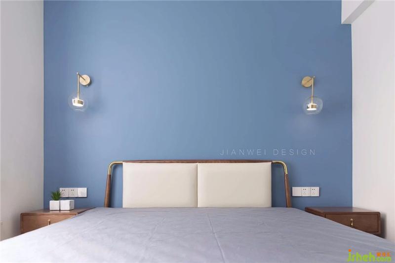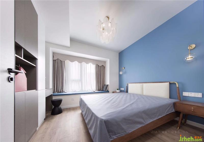 胡桃木黃銅架子床禪意而時尚,藍色飄窗墊與墻面漆呼應(yīng)。裝修設(shè)計