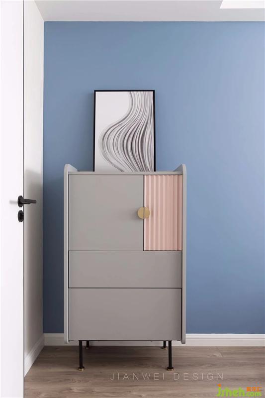 最為亮眼的個(gè)性斗柜,淺灰和煙粉的色彩搭配,溫暖整個(gè)空間。裝飾畫(huà)上的柔和弧形,給空間帶來(lái)了靈動(dòng)的氣息。