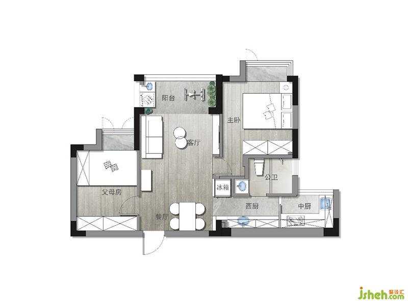 2.將原有洗衣機(jī)的位置改為中廚,以玻璃門(mén)間隔,向外增加西廚,提高采光和實(shí)用性,使區(qū)域布局規(guī)范化
