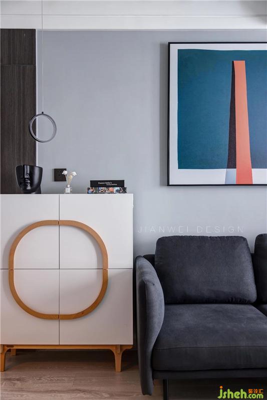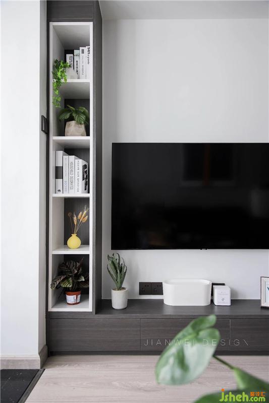 主臥門(mén)采用了隱形門(mén)設(shè)計(jì),與電視柜融為一體,左側(cè)的收納展示柜可容納不同尺寸的收藏。