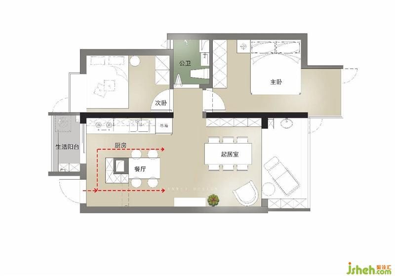 2. 由于原始煙道無(wú)法移位,造成入門(mén)處始終有一根礙眼的柱子。根據(jù)這個(gè)新出現(xiàn)的問(wèn)題,我們干脆把門(mén)廳和廚房做成雙通道流線(xiàn)。(見(jiàn)下圖虛線(xiàn))并順勢(shì)圍繞煙道柱增設(shè)了兩排收納柜。一來(lái)增加了整體收納空間,二來(lái)增加的柜面和煙道柱面無(wú)縫連接,形成了一面大小合適的餐邊墻。