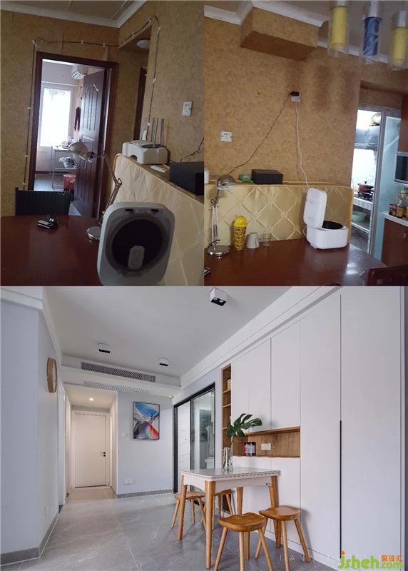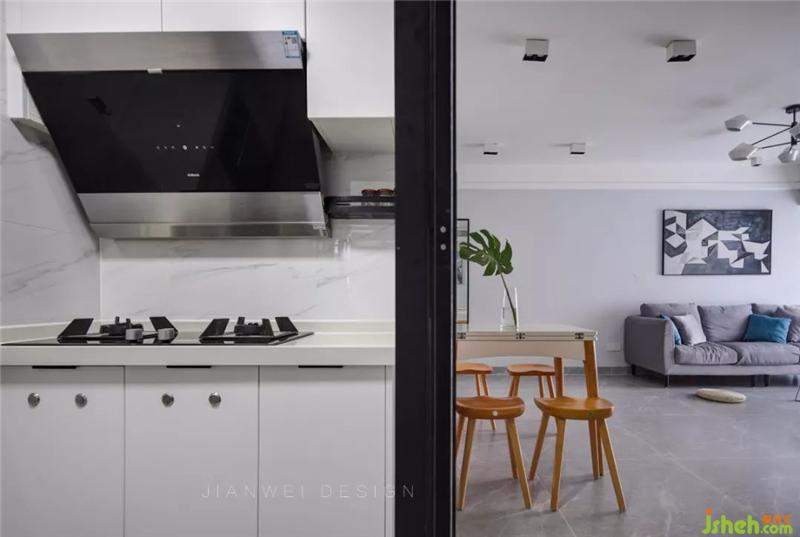 黑色的透明移門阻擋了廚房油煙進(jìn)入客餐廳區(qū)域,也將光線更好得引入進(jìn)了廚房,改造后的廚房已經(jīng)沒有了狹窄空間的壓迫感。室內(nèi)設(shè)計(jì)師