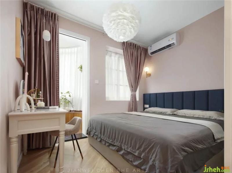 室內(nèi)設(shè)計(jì)極簡(jiǎn),粉色和藍(lán)色搭配的清新色調(diào)看起來(lái)既溫馨又不失浪漫,地面采用人字拼接實(shí)木,簡(jiǎn)約溫潤(rùn)自然。內(nèi)部增加了白色儲(chǔ)藏柜,方便衣物的儲(chǔ)藏收納。