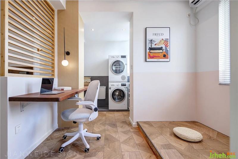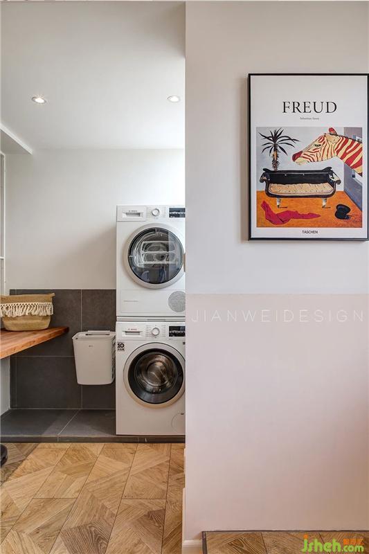 家務(wù)區(qū),摒棄傳統(tǒng)陽(yáng)臺(tái),洗烘衣機(jī)疊放,壁掛衣簍,提高了空間操作的便利性